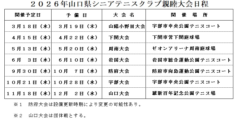 2026(令和8)年度山口県シニアテニスクラブの親睦テニス大会の日程が決まりました。