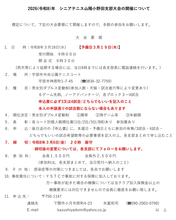 令和8年度 山陽小野田支部主催親睦テニス大会のご案内